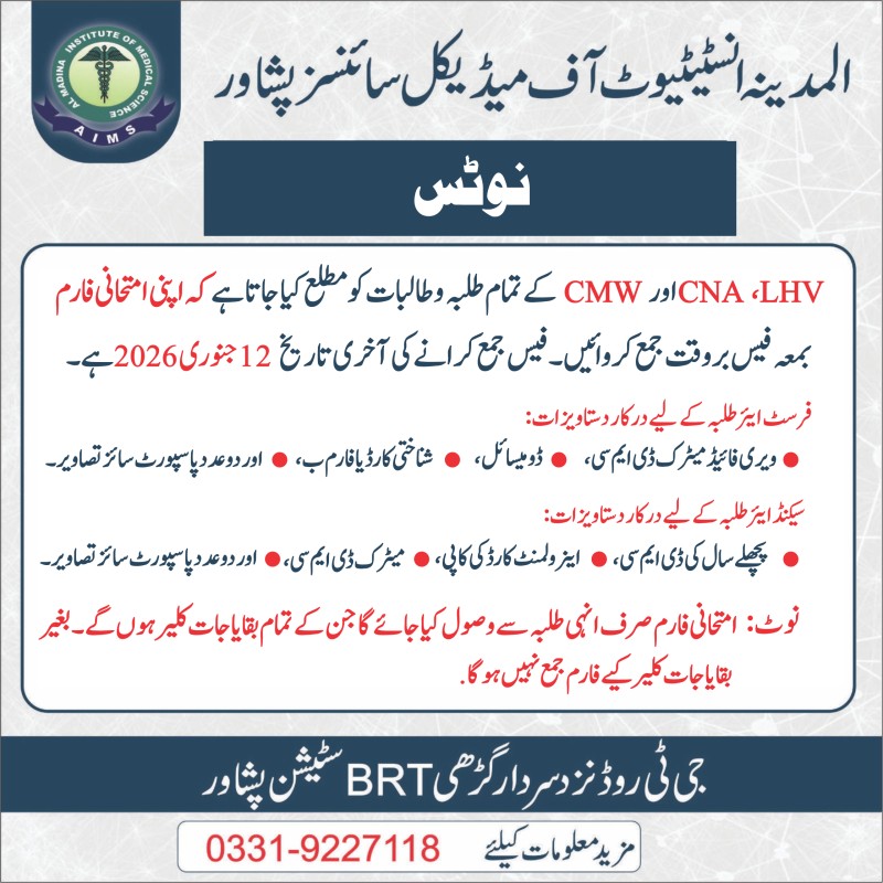 LHV, CNA, CMW EXAM NOTIFICATION Post author:Nadir khan Post published:January 24, 2026 Post category:Daily Notification Post comments:0 Comments You Might Also Like F.Sc Notification For Pre-Medical & Medical Technologies January 24, 2026 Leave a Reply Cancel replyCommentEnter your name or username to comment Enter your email address to comment Enter your website URL (optional) Save my name, email, and website in this browser for the next time I comment.